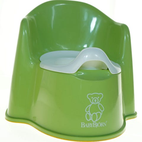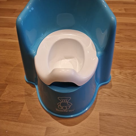 Babybjörn Barnepotte Set i plast. Settet består av en potte og et sete som kan plasseres på vanlig toalett for barn. Designet for å passe barn og gjøre toalettbesøk enklere og tryggere.
