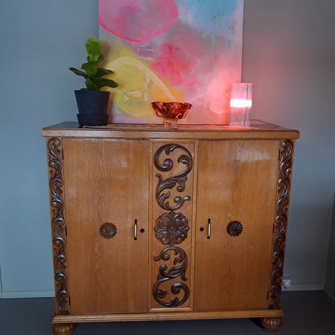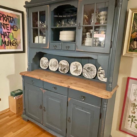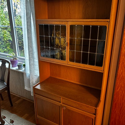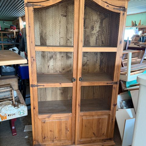 Pent vitrineskap i lutbeiset furu med glassdører til salgs.