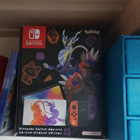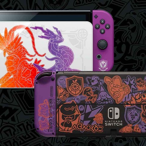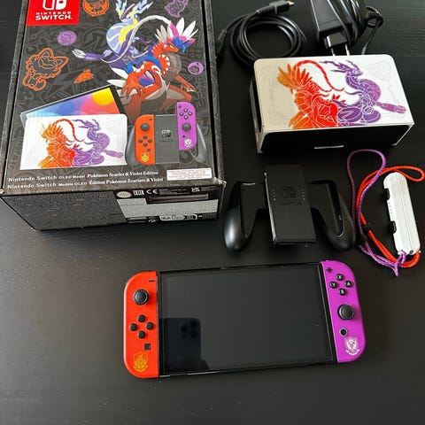 Nintendo Switch Oled konsoll med Joy-Con-kontrollere i oransje og lilla farger. Konsollen har et dekorativt deksel med fargerikt design. Inkluderer også dock for tilkobling til TV og ladekabel. Pokemon scarlet and violet edition