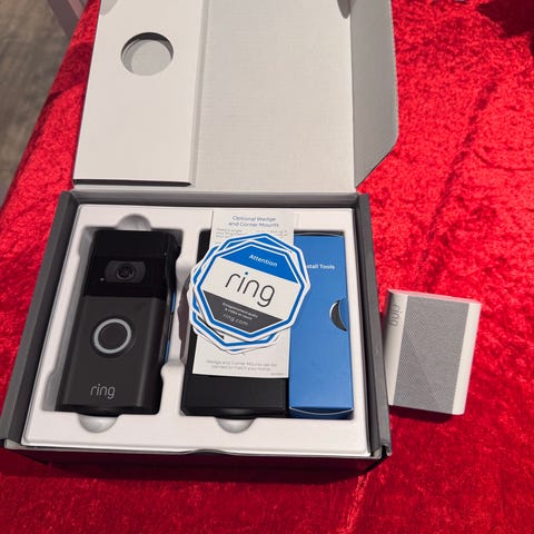 Ring video dørklokke med Chime høyttaler enhet. Veggfeste og skruer medfølger. God batterikapasitet. Enkel å konfigurere og montere. Gi bud.