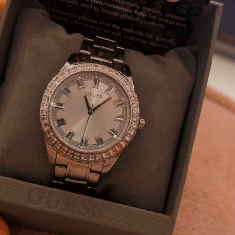 GUESS dameklokke med sølvfarget metalllenke og blå urskive. Klokken har en rund urskive med tydelige markeringer og en ramme med dekorative detaljer. Leveres i original eske. Fikk i julegave selges da jeg bruker gull nypris 2800kr selges for 1900kr