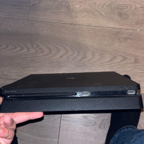 Sony Playstation 4 spillkonsoll i svart farge. Konsollen leveres med en svart kontroller og kabler.