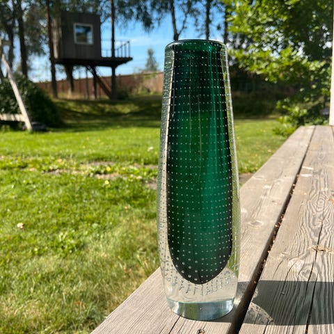 Unik, signert designvase av Willy Johansson for Hadeland Glassverk – ca. 26 cm høy. Vasen er i god brukt stand, uten synlige skader eller sprekker, med tydelig signatur på kanten. Dette er et klassisk stykke skandinavisk kunstglass som passer perfekt både som dekorasjon og som gave. Modellene av denne type er ifra 1950-60 tallet og har siden blitt Hadelands Glassverk sitt ansikt utad i verden, rett og slett en anerkjennelse/logo/maskot. Det er få i salg så denne boblende "istapp", eller smeltende fossefall kanskje, er et kupp uansett. Klinkende klar til buketten vasen som også holde godt med vann til blomstene dine.