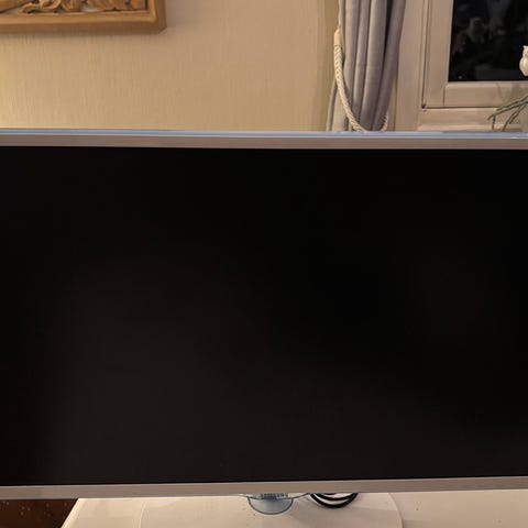 Samsung S27E370H 27" skjerm med hvit ramme og stativ. Skjermen har HDMI- og VGA-