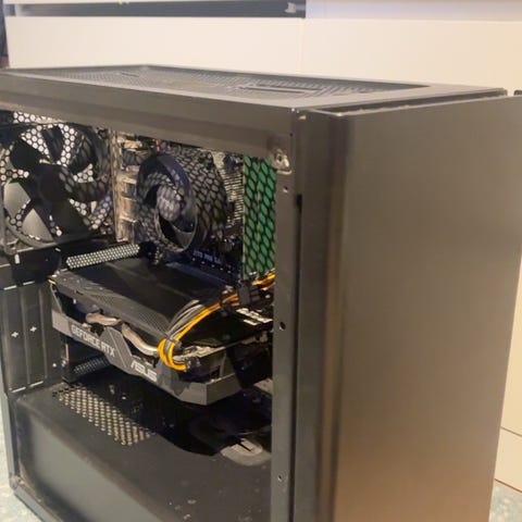 Asus stasjonær gaming-PC med RGB-belysning. PC-en har flere vifter med fargerik LED-belysning og et gjennomsiktig sidepanel som viser intern maskinvare og kjølesystem
