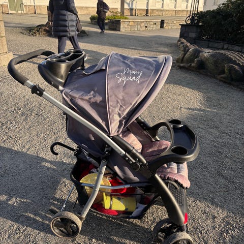 Baby Jogger barnevogn i mørk lilla farge. Barnevognen har tre hjul og en stor solskjerm. Egnet for barn, designet for utendørs bruk og enkel manøvrering.
