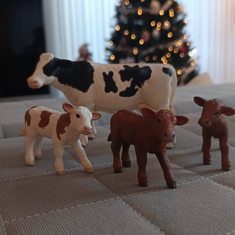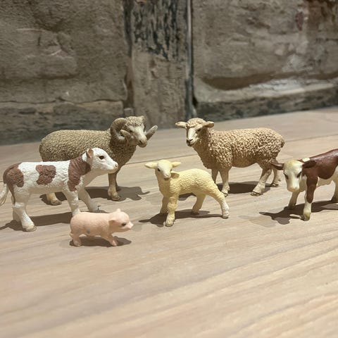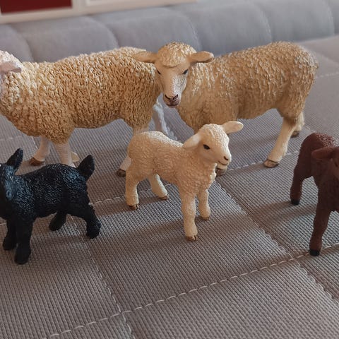 Inkluderer blant annet kuer, sauer, hester, kalv, hane/kylling og hund (se bilder).
