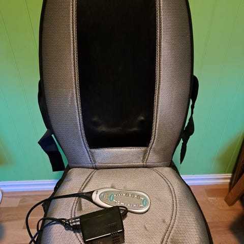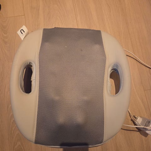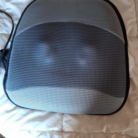 Massasjepute med varmefunksjon, designet for hjemmebruk. Putens overflate har et pustende nettmateriale, og den har en justerbar stropp for enkel festing og bruk. Strømtilførsel via medfølgende adapter. Passer for avspenning og muskelmassasje i nakke og rygg.