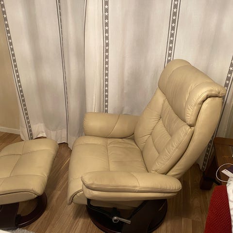 En god lenestol selges grunnet flytting, ingen synlige skader men skinnet bærer preg av alderen. Usikker på alder på stolen da mine foreldre hadde den før meg