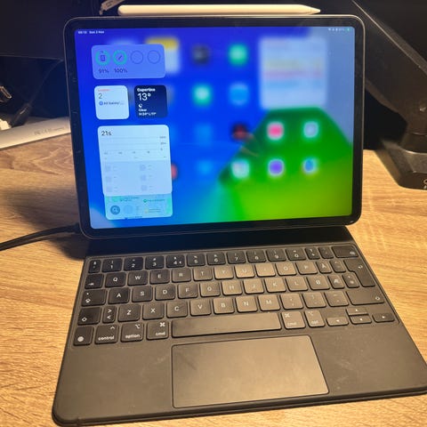 Apple iPad Pro 11-tommers med 256 GB lagringskapasitet. Enheten har et beskyttende deksel og følger med Apple Pencil Pro. iPad-en har iPadOS versjon 16.2 og en batterikapasitet på 100%. Serienummer og garantiinformasjon er tilgjengelig.
