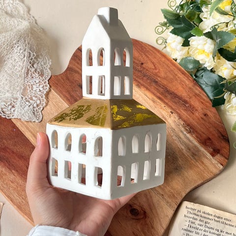 Kremmerhuset dekorasjonshus laget i hvit keramikk. Huset har flere åpninger som vinduer og dører, og kan brukes som dekorasjon i hjemmet. Passer til innendørs bruk.