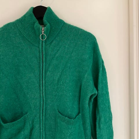 Stilig grønn jakke med glidelås. Lite bruksmerke (se bilde).
