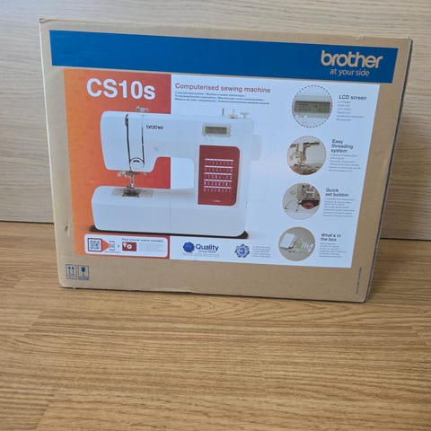 Brother cs10s symaskin med flere sømvalg og tilbehør inkludert. Maskinen har en digital skjerm og leveres med ulike trykkføtter og nåler for forskjellige syprosjekter.