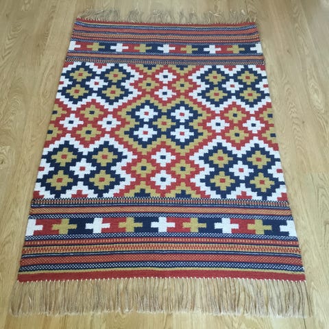 Høyde 170 cm. Bredde 125 cm ink 10 cm frynser. Etikettmerket Jølsteråkle. Audhild Viken. Tykk ull. Vakkert åkle.