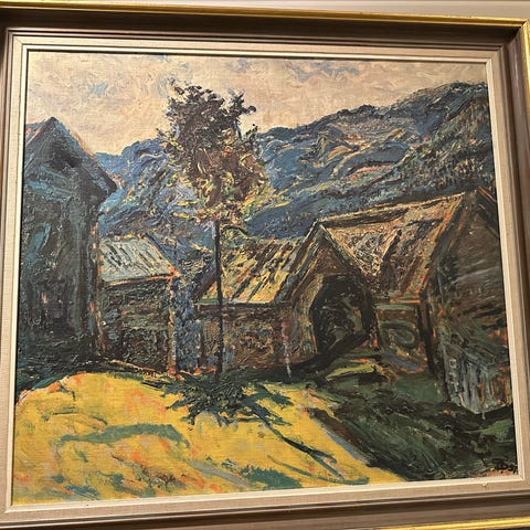Bilde selges med ramme og passepartout, og fremstår i pen stand med normal aldersslitasje. Teknikken er trolig pennetegning eller grafikk, men ikke endelig bestemt. Mål med ramme kan oppgis ved behov.