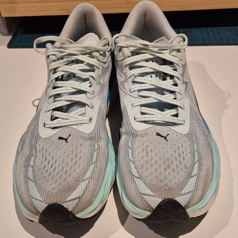 Adidas løpesko i størrelse 42 og 2/3. Skoene har en lys farge med rosa detaljer og er designet for løping.