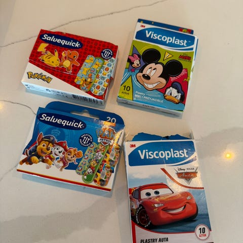 Assortert samling av plasterpakker i forskjellige størrelser og materialer. Inneholder både vanlige hudfargede plaster og plaster med mønster. Egnet for generell bruk ved mindre sår og skraper.