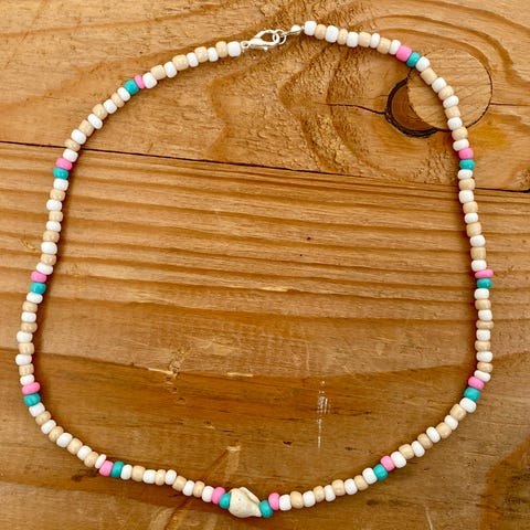 #perlekjede #smykker #skjell #bohosmykke #nordafrika #hvit #beige #turkis #rosa #tisevennlig #gjenbruk #tisefinds #unikstil