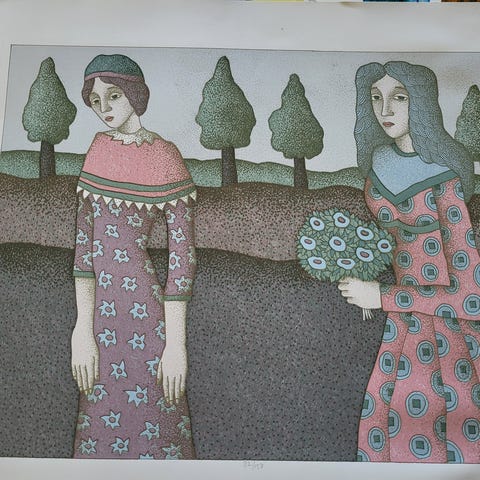 Du må ikke kjøpe alle. Kun de du ønsker. Jeg har flere av hvert motiv. Ca. mål på bare bildet (plano) 37x43 cm.