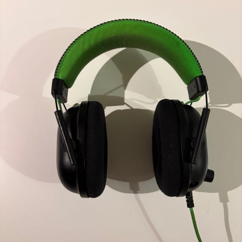 Razer BlackShark V2 gamingheadset med svart farge. Headsettet har en justerbar av og på knapp for mikrofon og er designet for komfort under lange spilløkter. Det har lydisoleringsegenskaper og kobles til via kabel med grønn ledning.