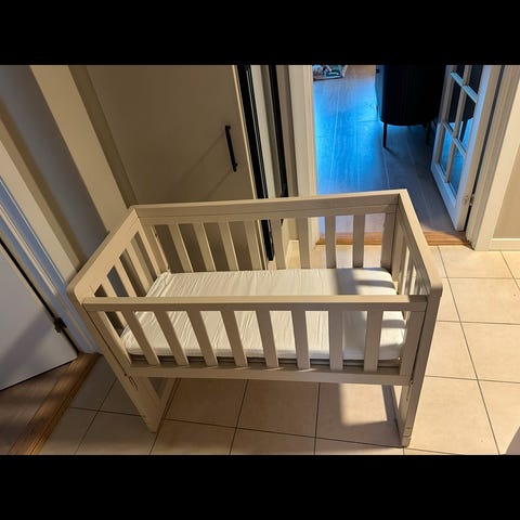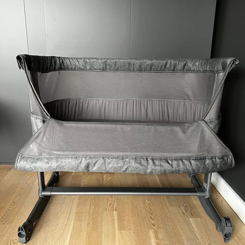 Carena bedside crib designed for convenient placement next to adult beds. The crib features a sturdy frame and breathable mesh sides for ventilation and visibility. It provides a safe sleeping space for infants within easy reach of caregivers.