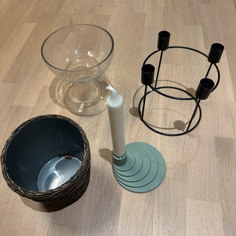 Diverse dekor gis bort mot henting. Vaser, lysestaker, dekor fra diverse merker. Menu, HM home, bolia etc