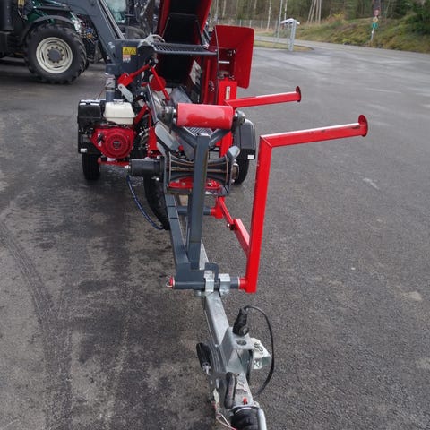 Maskinen har Stokke løft, som følger med. I tillegg er det montert vinsj som kan brukes til vanskelige og store stokker. På håndtak som styrer sag og kløyver har jeg satt på ekstra håndtak som gjør arbeidsfunksjon mye lettere.. Det er en evo 30, men har 36 sverd og kjede.