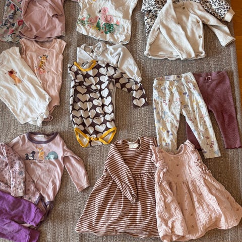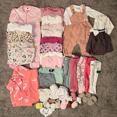Selger en flott klespakke i størrelse 62, brukt av ett barn født i mai. Klærne passer derfor godt til vår- og sommerbruk. En del av plaggene har et jentepreget uttrykk, men mye kan også brukes kjønnsnøytralt.