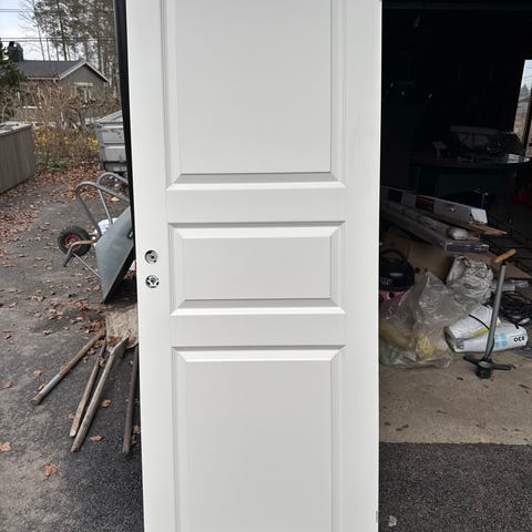 Hvit innerdør fra Swedoor Døren har et moderne design med horisontale riller. Hel tre dør. Mål : 80x210. Følger med karm og dørhåndtak.