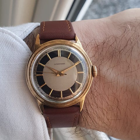 En fin vintage Junhans klokke selges. Flott tidløs klokke med svært tynn urkasse. Klokken tikker og går, servicehistorikken er ukjent.