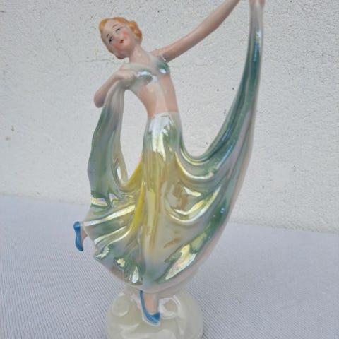 Figur av rokokko dame i porselen, med grønn og hvit farge. Figuren viser en kvinne i en pose med hånden bak hodet og detaljer i ansikt og hår, passer til del av nålepute, str. 11cm