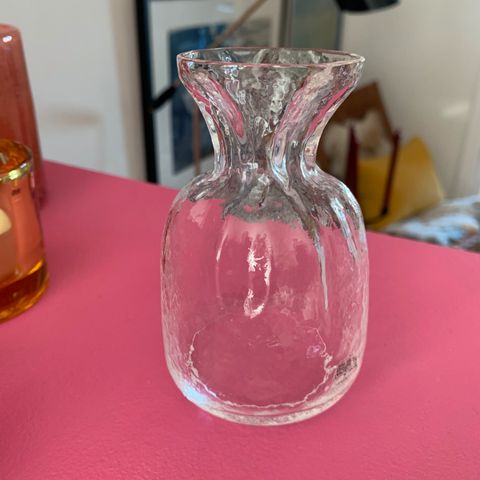 Ca. 15 cm høy olivengrønn glassvase med klar fot.