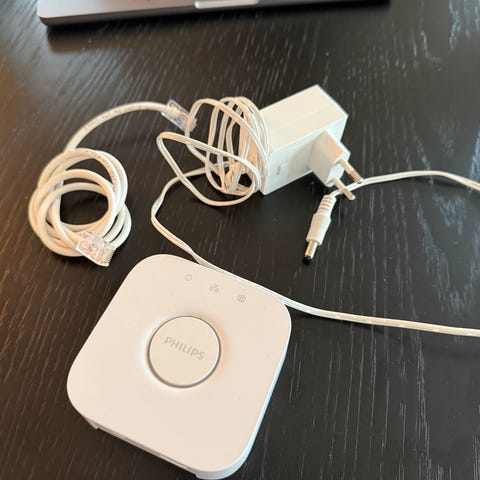 Philips Hue Smart bridge med Wi-Fi-tilkobling. Inkluderer strømadapter og nettverkskabel. Enheten er designet for å koble og styre Philips Hue smartlys via nettverk.