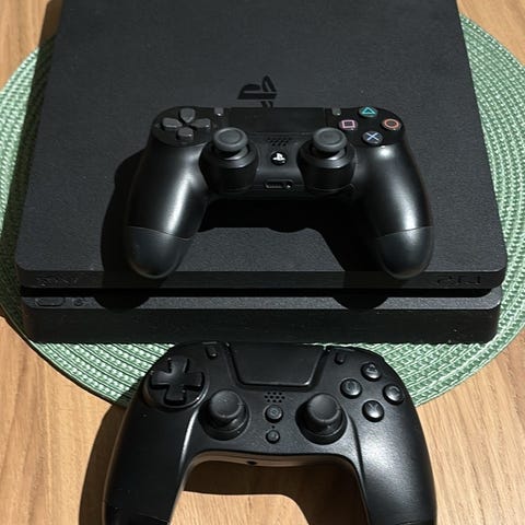 Sony Playstation 4 spillkonsoll med to trådløse kontrollere.