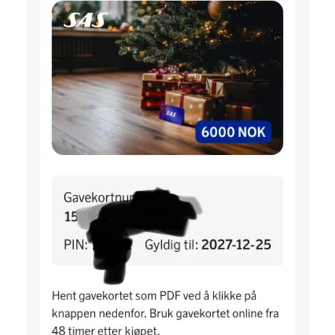 SAS gavekort med verdi på 6000 kr, selges til 5500.