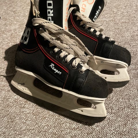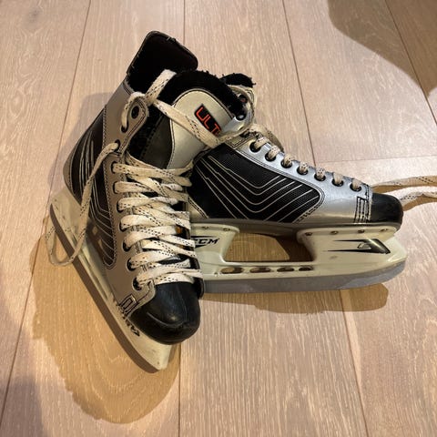 CCM Ishockeyskøyter i størrelse 38 for barn. Skøytene har svart farge. Noe rust rundt hullene til lissene, ellers uten anmerkninger.