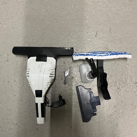 Nilfisk Smart vindusvasker med tilbehør inkludert ulike munnstykker og ladekabel. Enheten er designet for rengjøring av vinduer og andre glatte overflater. Leveres med bruksanvisning.