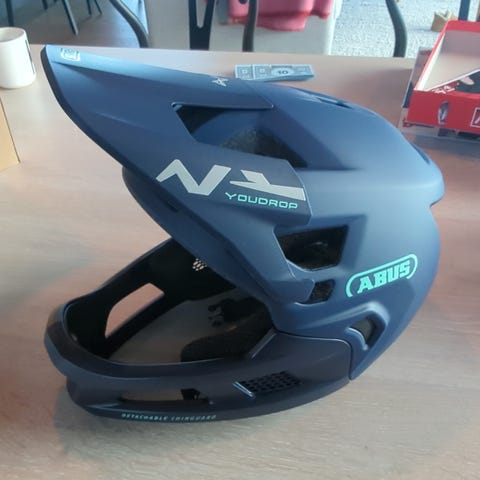 Fullface-hjelm med avtakbar hakebeskyttelse.