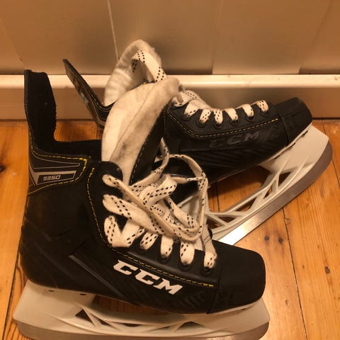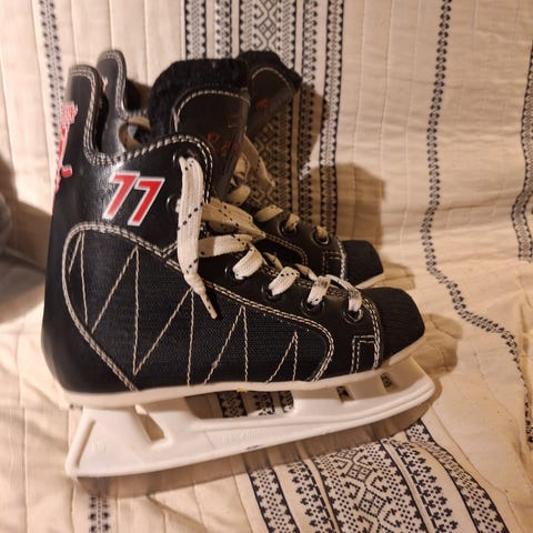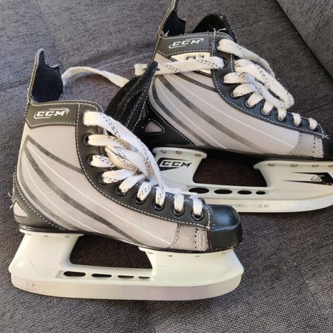 Aigenerert: CCM Ishockeyskøyter for barn. Designet for ishockey med svart, hvit og rød fargekombinasjon. Skøytene har snøring og er laget for å gi støtte og komfort under ishockeyaktivitet.