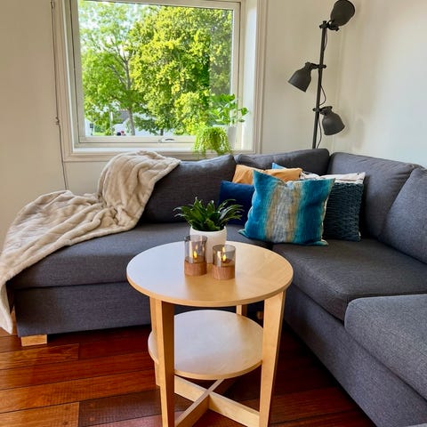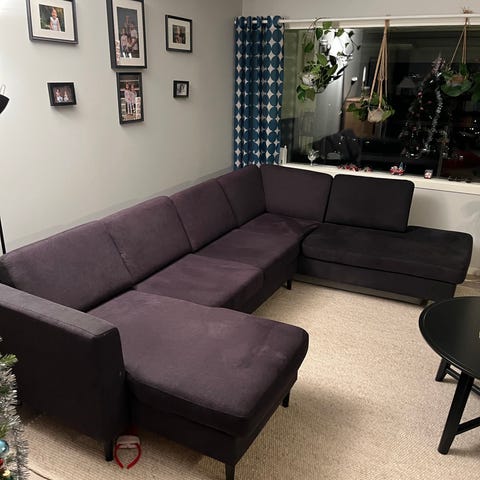 Stor, myk og svært behagelig sofa gis bort. Sofaen er godt brukt og bærer preg av dette. Det ene armlenet har sunket noe sammen (se bilde), men sofaen er fortsatt fullt brukbar og god å sitte i.