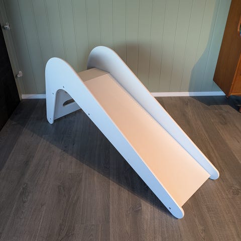 Jupiduu! Nå kan barna skli i stua eller på eget rom! Jupiduu sin sklie kombinerer estetikk, funksjonalitet og lek på en fantastisk måte, og resultatet er en sklie laget i treverk som passer inn på ethvert barnerom - eller stue! Noe bruksmerker, men veldig fint brukt.