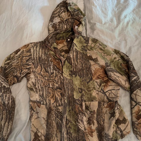 Kamuflasje jakke og bukse sett i mønster som etterligner naturlig vegetasjon. Designet for å gi god kamuflasje i skogsområder. Egnet for jakt eller utendørsaktiviteter der kamuflasje er ønskelig.