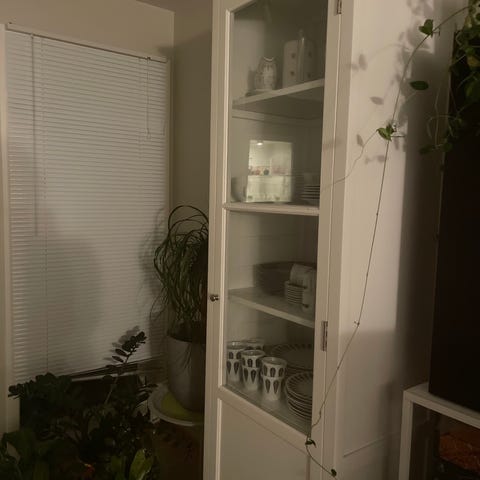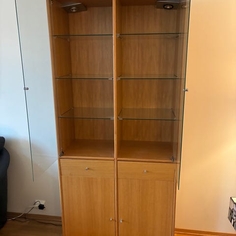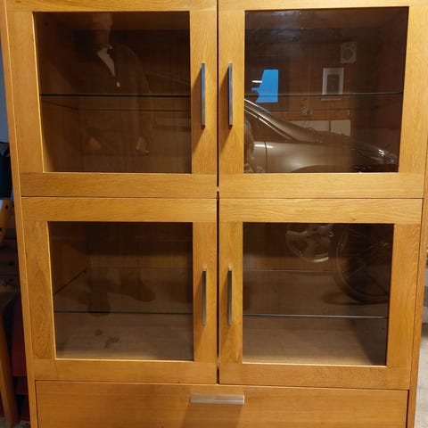 Pen brukt todelt skjenk i eik med vitrineskap. Tre originale nøkler følger med og lyset i skapet fungerer. Må hentes.
