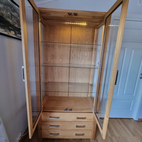 Pen brukt todelt eikeskjenk med vitrineskap. Tre originale nøkler følger med og lyset i skapet fungerer. Må hentes snarest.