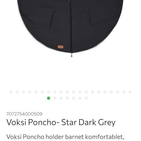 Nettsiden skriver: Voksi Poncho holder barnet komfortablet, varm og beskyttet i sin bilstol uten at det begrenser sikkerheten i bilen. Den kan brukes både i og utenfor bilen.