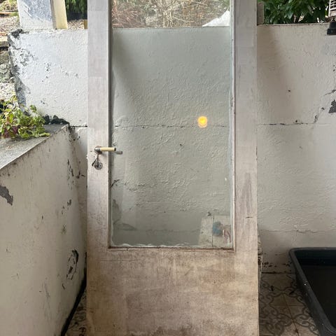 Solid dobbel heltre/edeltre terassedør fra 83. En rute punktert, ellers trenger den kanskje litt fiksing på låsen(virker, men er litt vanskelig) og maling. Fin til drivhus, hagestue osv. Gis bort mot henting i Tysvær.