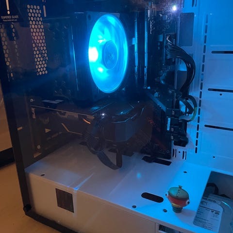 Asus stasjonær PC med Corsair CX500 strømforsyning, integrert kjølesystem og RGB-belysning. PC-en er montert i et svart kabinett med flere vifteplasser og har Asus-merket grafikkort. Systemet er egnet for generell bruk og gaming.