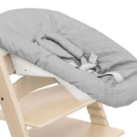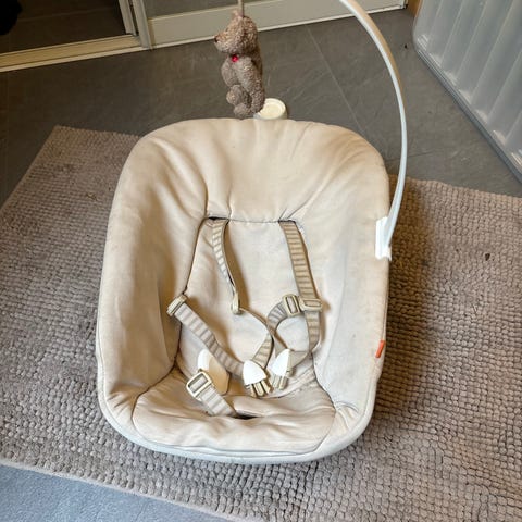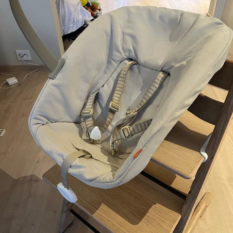 Stokke barnestol med mykt polstret sete og sikkerhetssele. Stolen har en solid plastbase med ventilasjonshull og festemekanismer for stabilitet. Designet for barn, med fokus på komfort og sikkerhet.