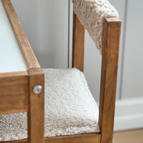 Flisat barnebord og krakk med trofast oppbevaring
