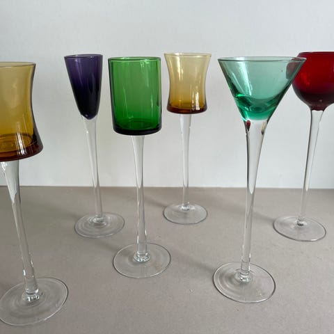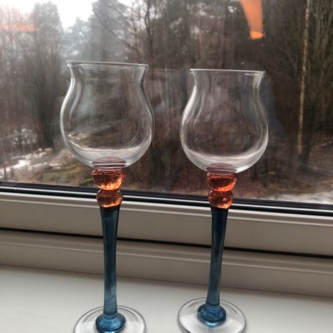 Kunstglass, alle glassene er ulike utformingen. Kan brukes som pynt eller til å drikke av.